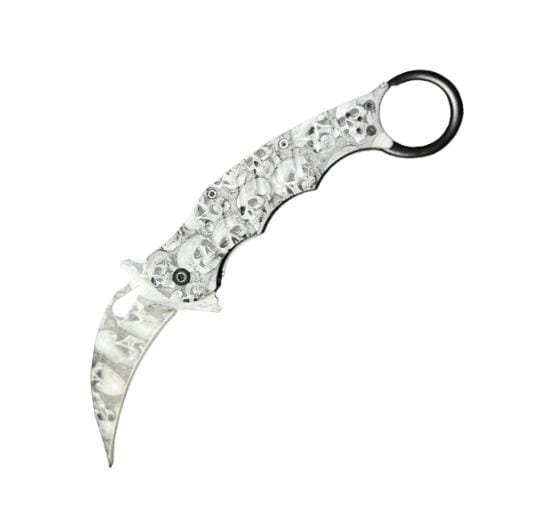 La Navaja Asistida Karambit FA-33 Camuflado Cráneos Blanca de 16 cm es un cuchillo táctico con un diseño impactante y funcional. Inspirado en la tradicional forma del karambit, esta navaja es conocida por su hoja curva y su uso versátil, tanto en situaciones de supervivencia como de defensa personal.
